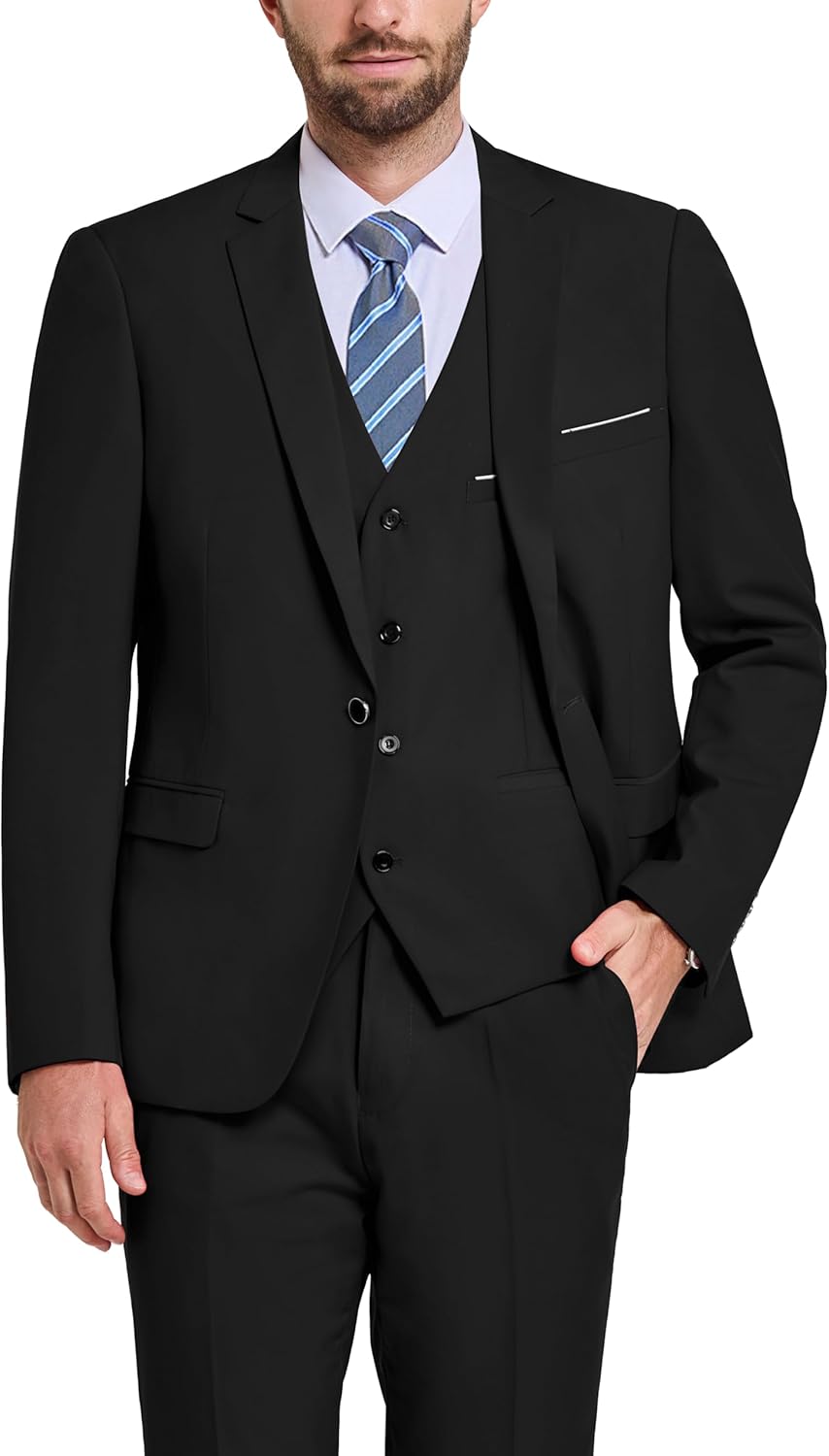 - – Refined Elegance, Tailored Confidence: A three-piece slim fit suit set features an exquisite single-button jacket, complemented by a vest and flat-front trousers. Each suit comes with a matching silk tie, flawlessly showcasing your unique style. Available in various sizes and colors for your selection. All internal and external pockets are practical, adorned with refined chrome buttons. suits harmonize fashion, comfort, and affordability, striving to meet all your expectations.